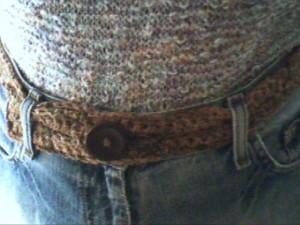 I had 50gms of worsted, hand-painted, cotton in my stash that was a lovely colour but was really too coarse to incorporate into a garment. It seemed best suited to a belt but I don’t like belts that tie. And I didn’t have a nice buckle lying Round either. What I did have was quite a few large, odd, buttons. So I began to play with the idea of a belt that buttoned rather than buckled.